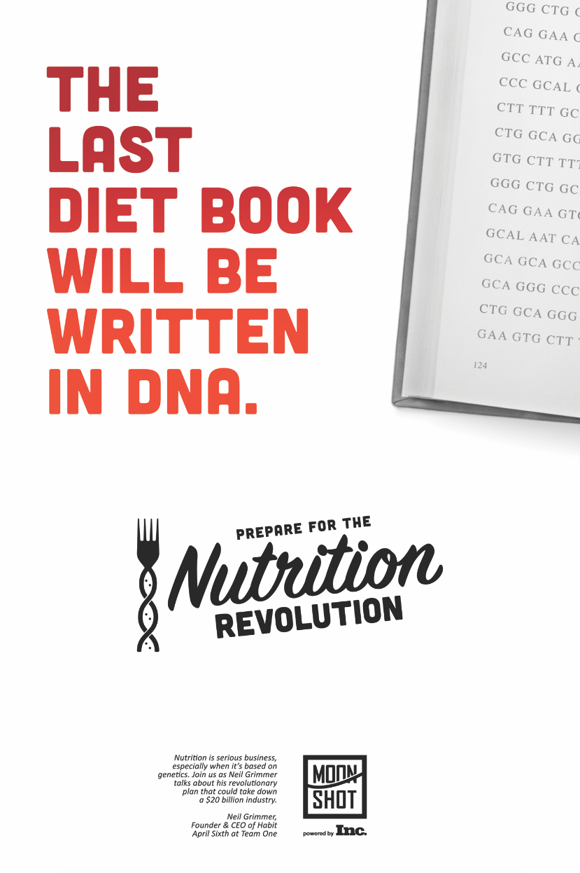 The Solution: There's no such thing as the right diet for everyone. That’s why Neil Grimmer created Habit, a personalized nutrition program based on your own blood and DNA samples. These thought-provoking pieces not only attracted a large audience for the event, they led to Neil asking Team One to help him launch his brand.